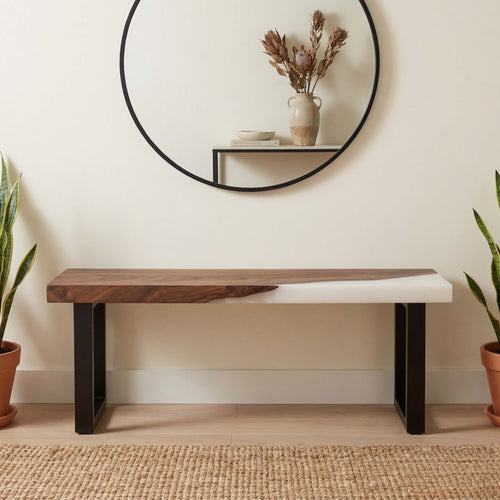 Table rivière personnalisée en bois d'olivier et résine époxy, finition perle givrée VRJ-683 -