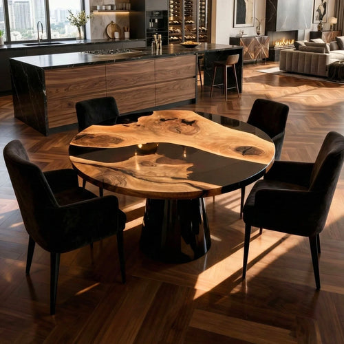 Table rivière sur mesure en résine époxy et bois d'olivier, finition piano noir, VQA-582 -