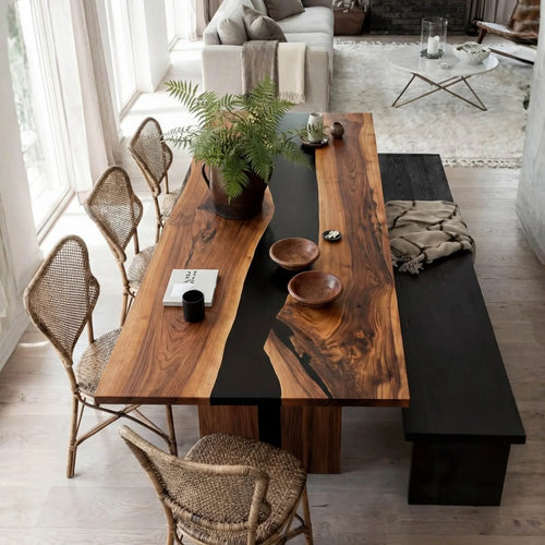Table rivière sur mesure en bois d'olivier et résine époxy, noir onyx JQT-472 -